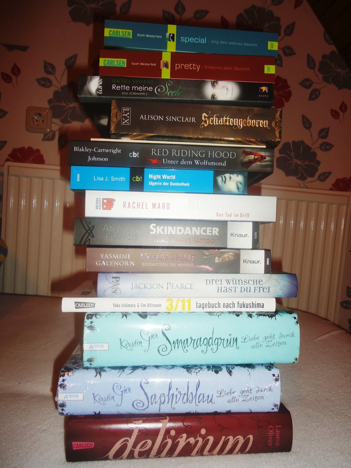 Da ich auch meistens nicht sooo viele Bücher kaufe - einfach aus dem Grund, dass ich nicht viel Geld besitze [oder es für meine anderen Hobbys/andere Unterhaltungsmedien ausgebe] und weit, weit weg von einer Buchhandlung wohne - verändert sich der Stapel auch nie großartig. Das liegt aber auch großteils daran, dass ich mir am Anfang des Jahres eine Liste zusammengestellt habe [Ich bin der Typ von Mensch, der sich gerne zu allen möglichen Sachen Listen macht.] welche Bücher ich mir im Jahr so kaufen werde. Demzufolge spare ich auch nur so viel, bzw spare etwas mehr aber gebe immer nur so viel aus. Immerhin sind nicht nur Bücher ein teures Hobby...
